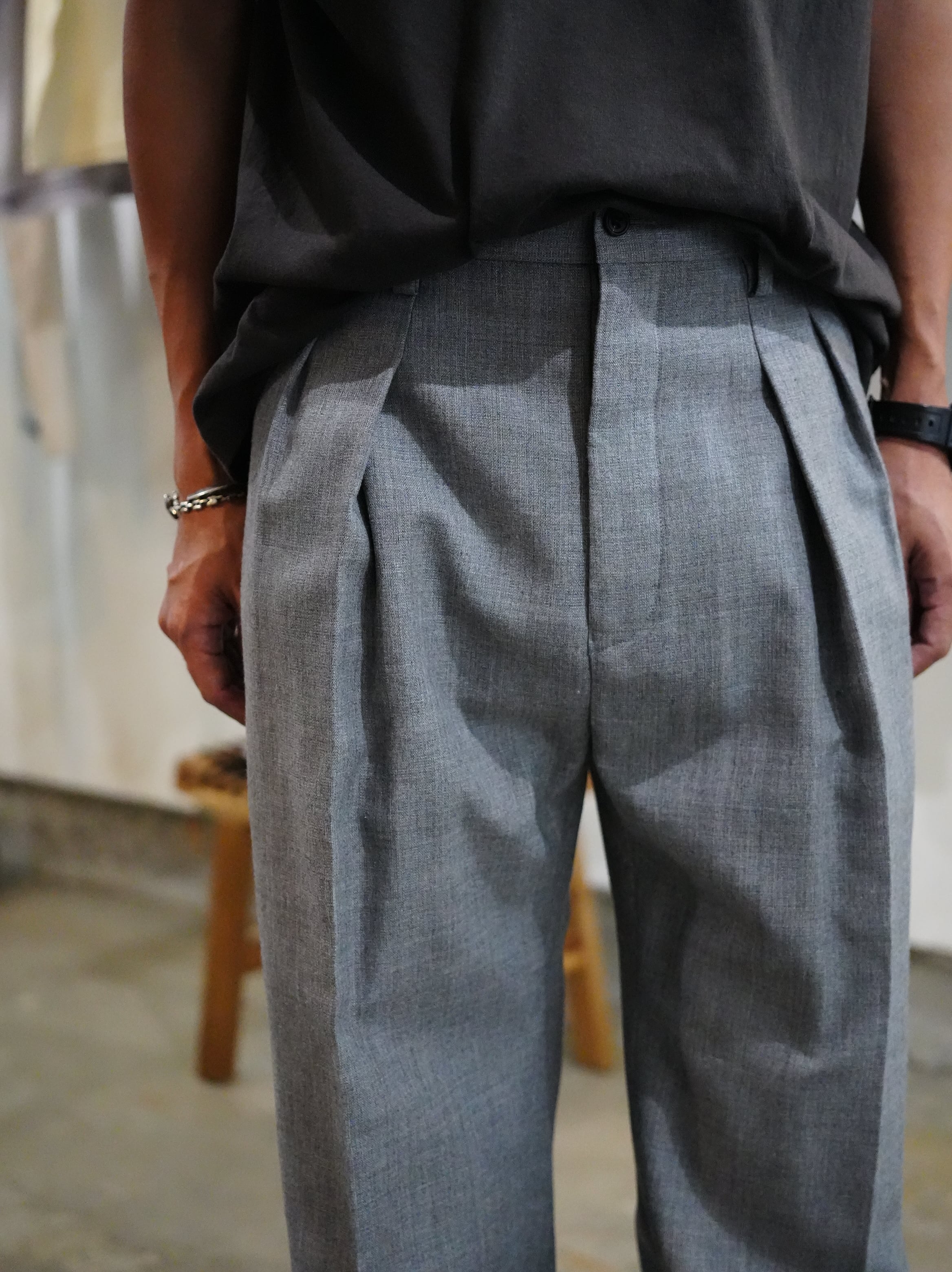 Doni's Trousersは、デザイナーが敬愛するフランス人映画監督レオス・カラックス作品に登場するフランス人俳優ドニ・ラヴァンに捧げるスラックスで、ブランド創設時から毎シーズン改良を重ね、日本の職人によって丁寧に仕立てています。オリジナルで制作したリネン混のウール素材を使用したツータックのスラックス。日本製。