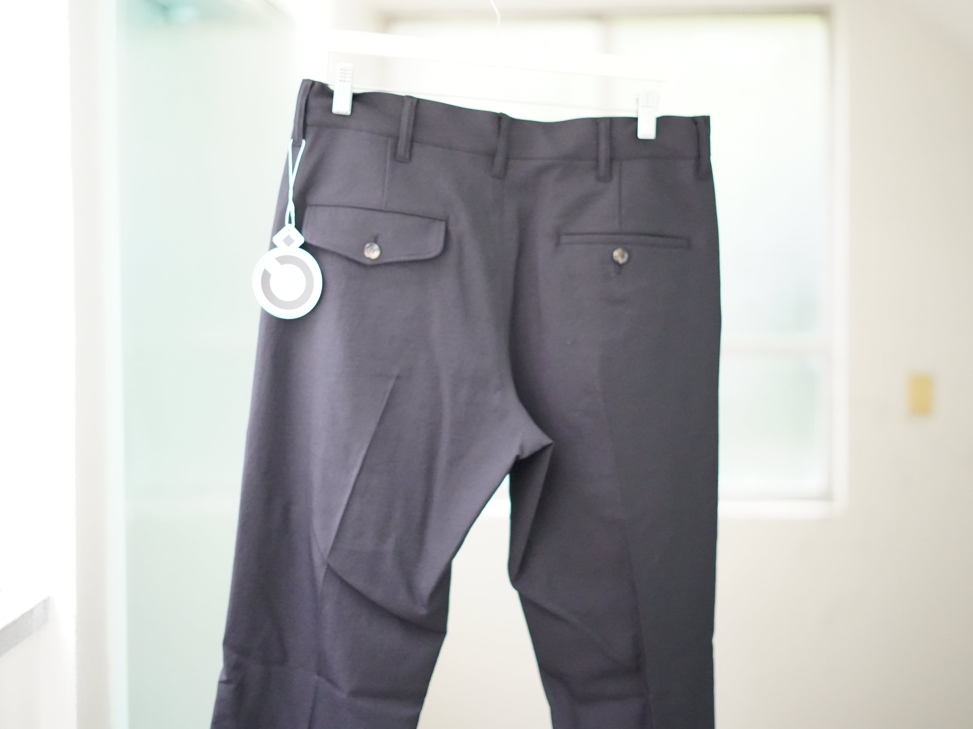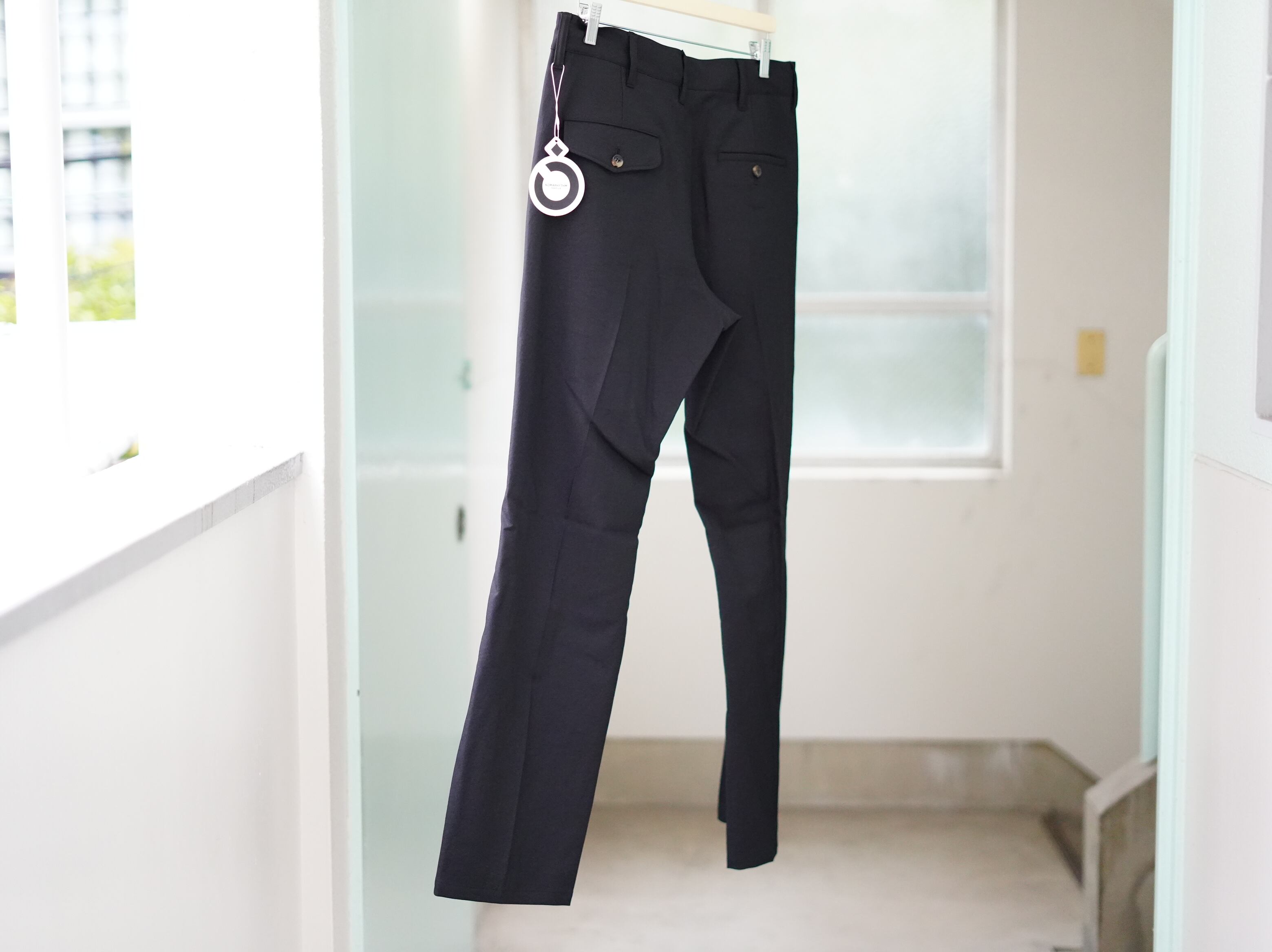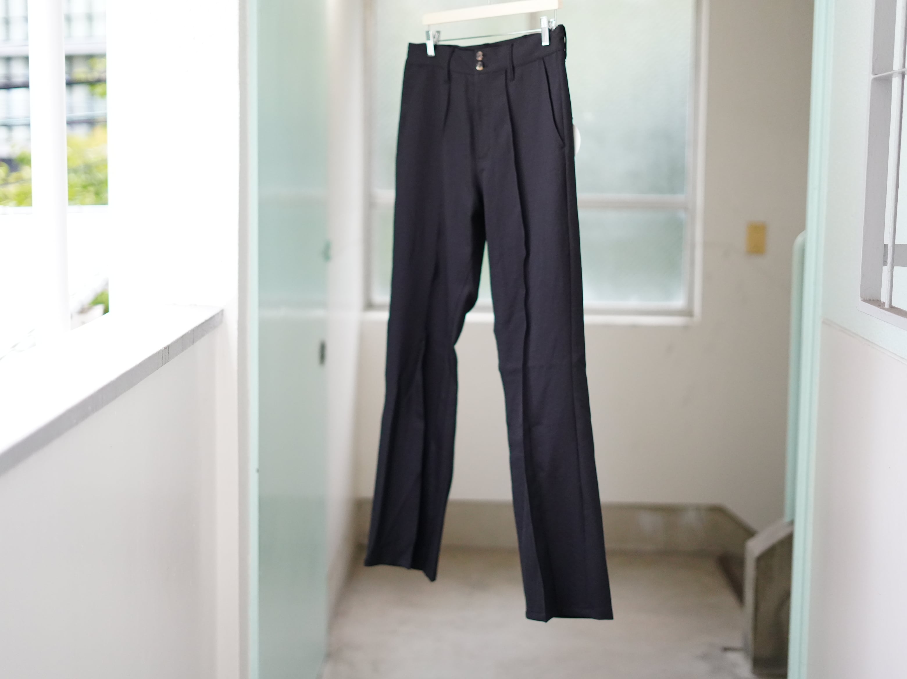 軽やかな素材を用い、ブーツカットのレッグラインにセンタープレスを施すことで、足元に美しい落ち感を生み出しています。
