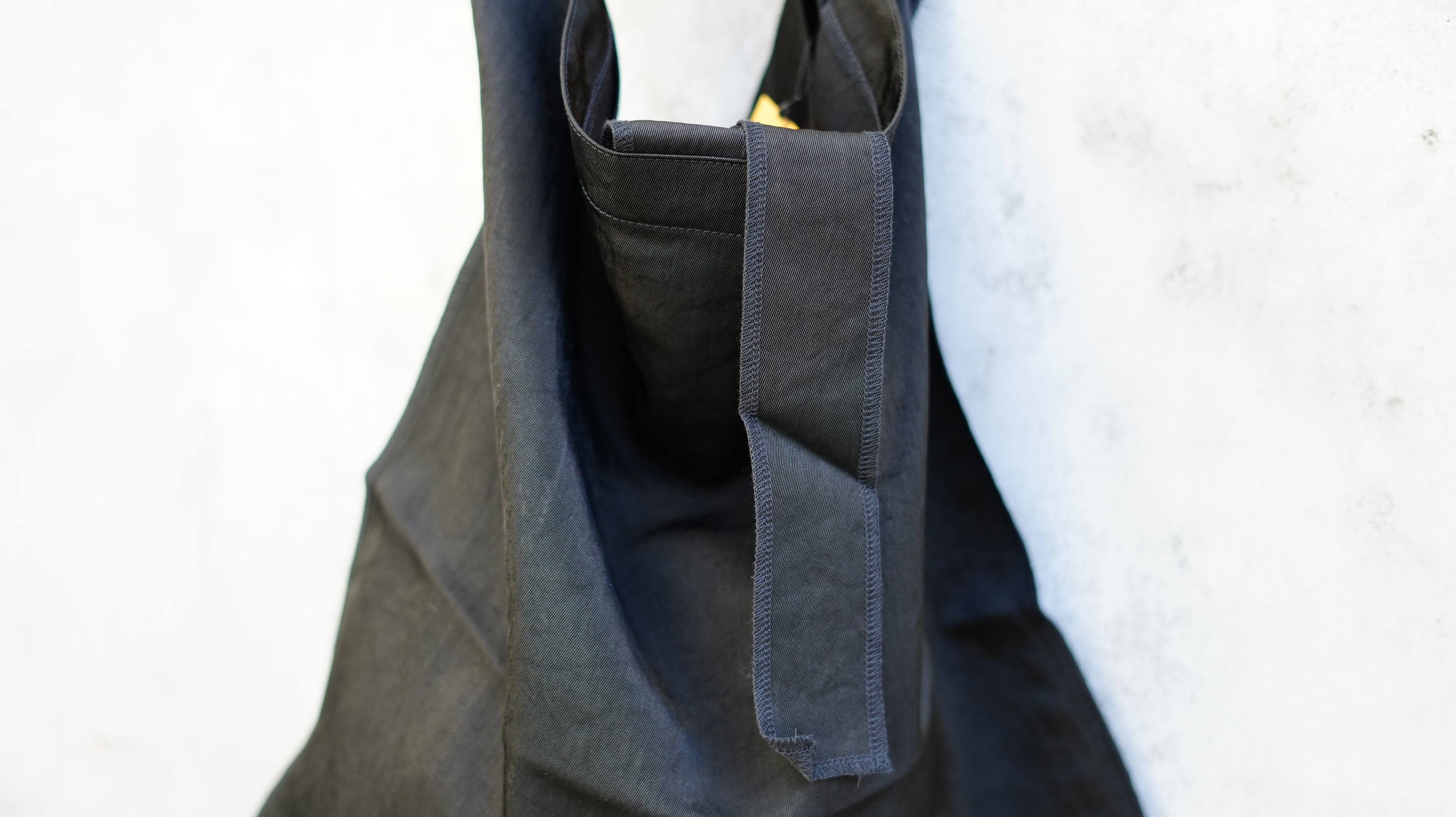 裏返したようなデザインが特徴的なワンショルダートートバッグ。S、M、Lの3サイズ展開のLサイズです。ウェアを製造する縫製工場にバッグの仕様を依頼することで、バッグメーカーにも服メーカーにも無い、類を見ない空気感漂うアイテムに仕上げています。