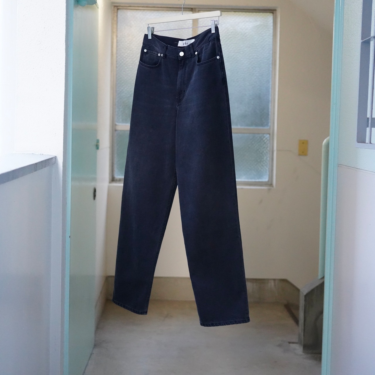 12オンスのウォッシュドコットンデニムを使用した、ワイドカットジーンズ。