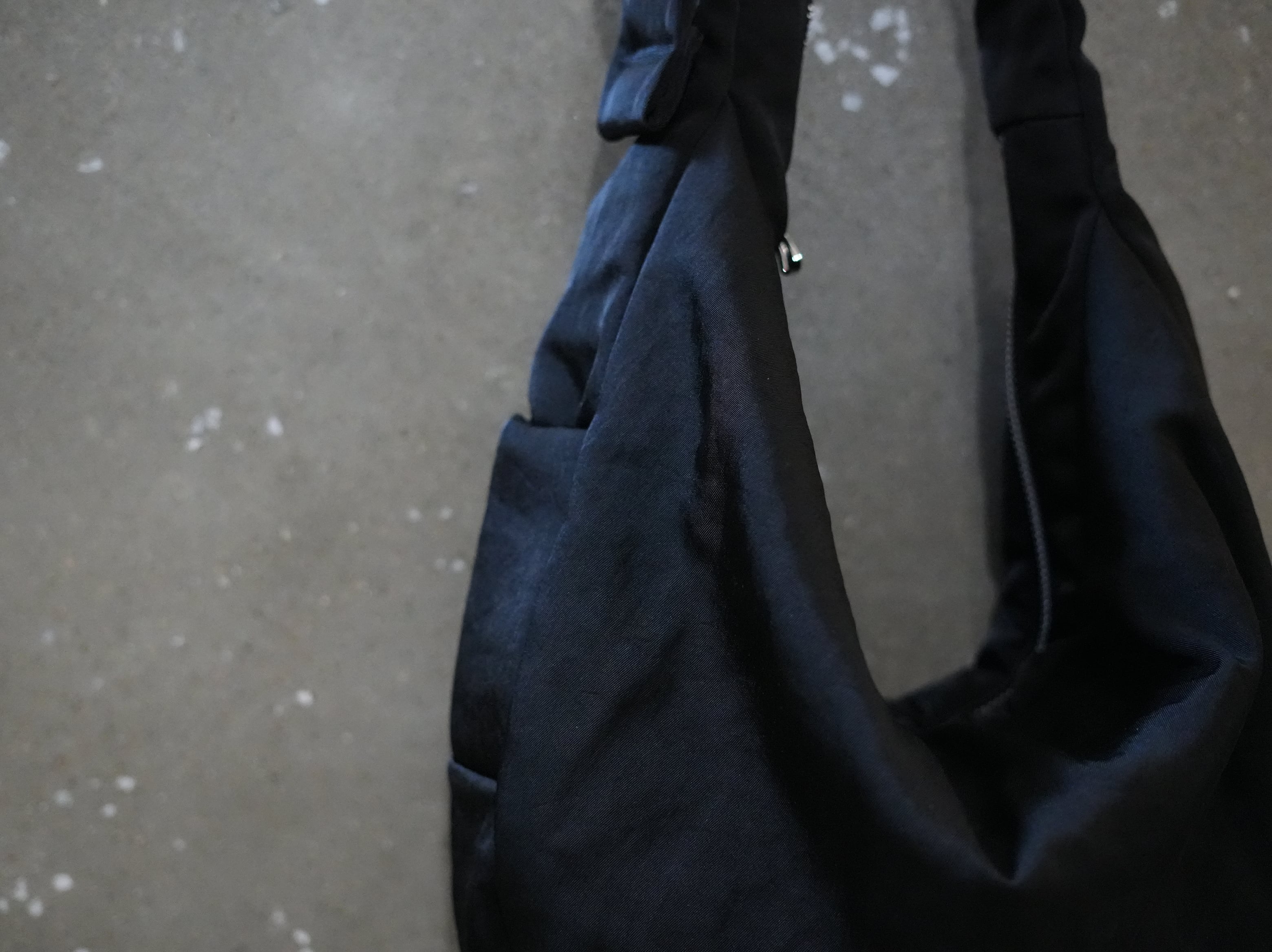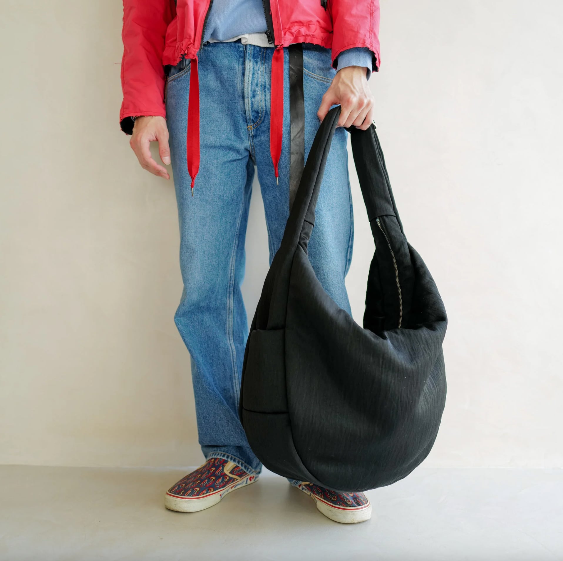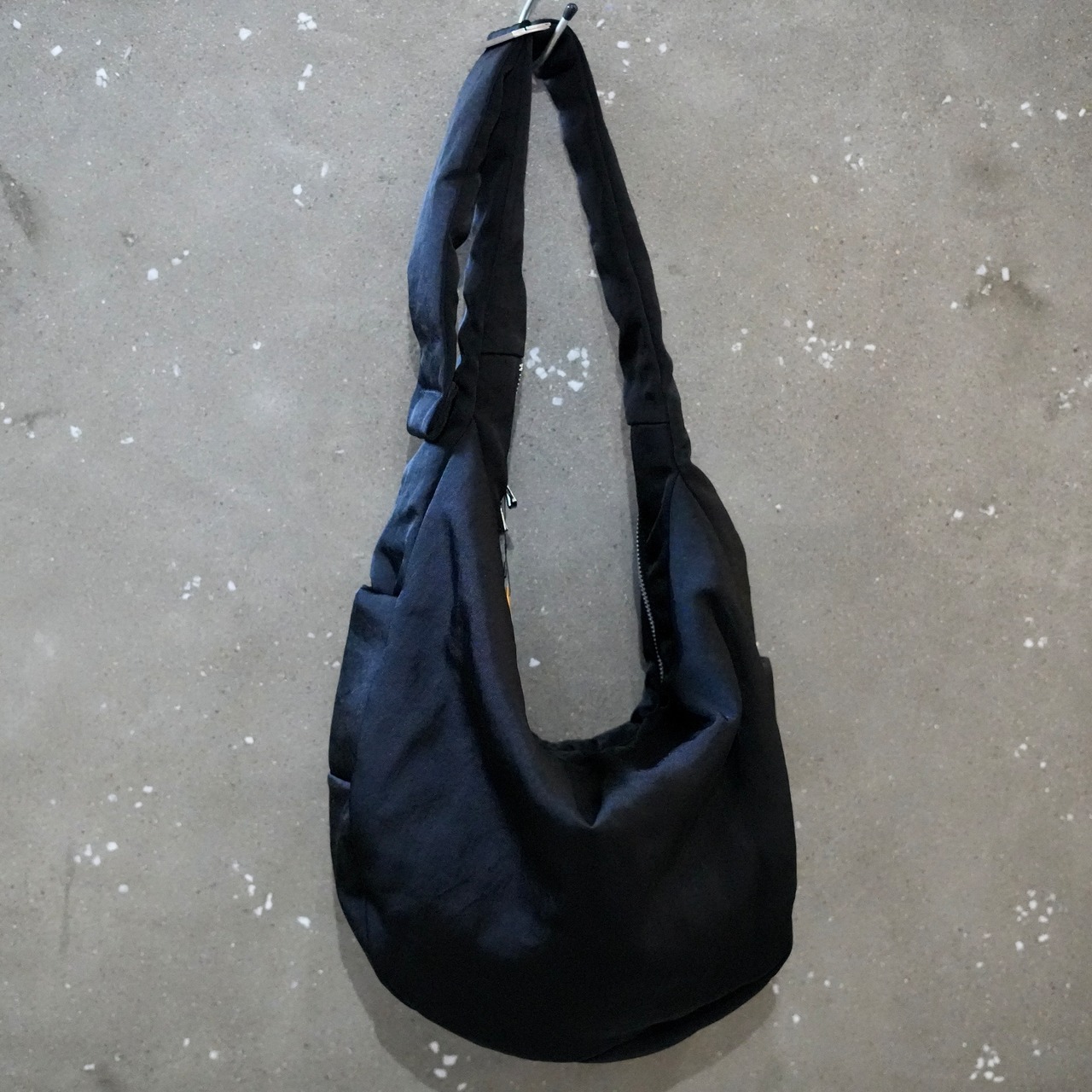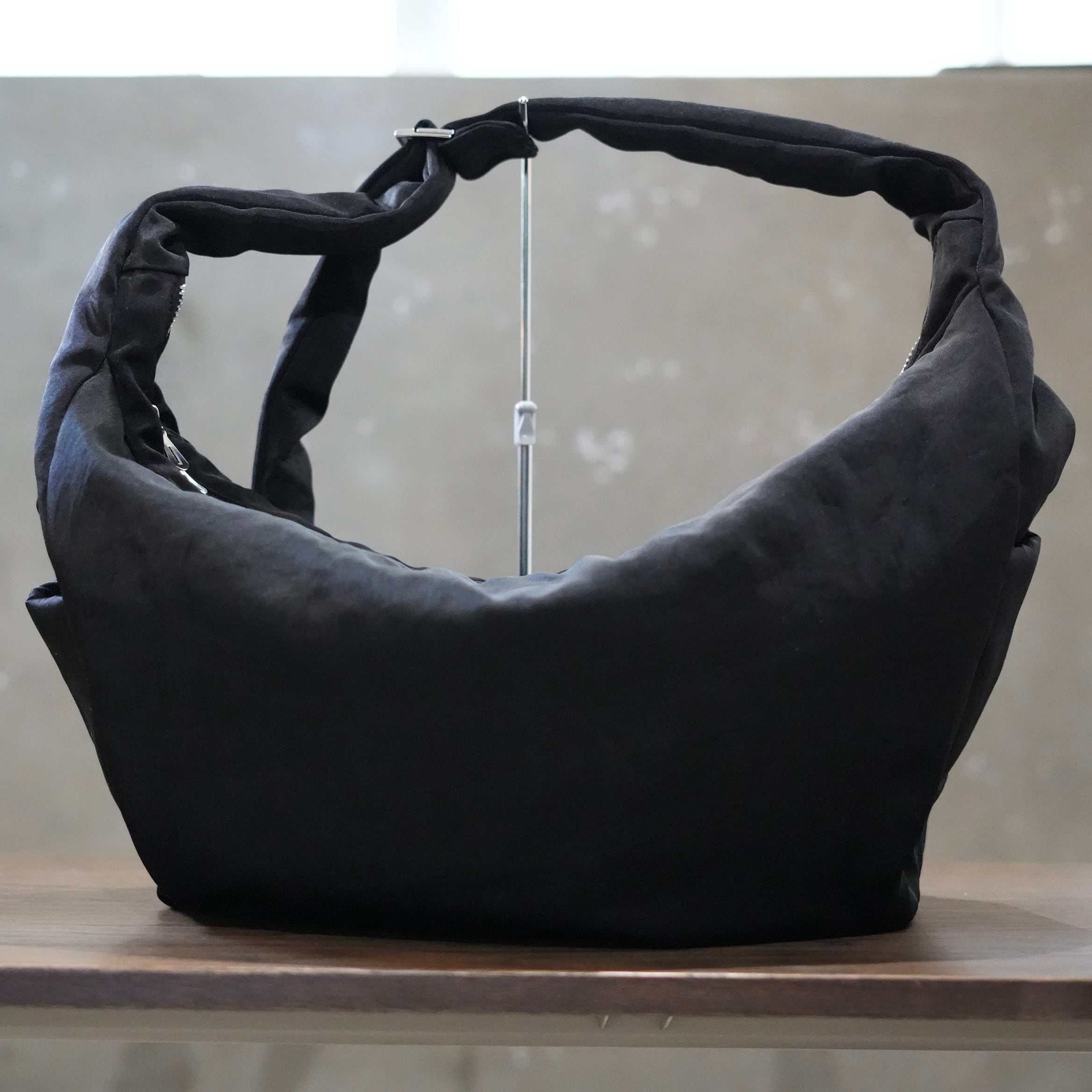 服を身に纏うような、オーバーサイズの三日月型ショルダーバッグ。軽量なアウターを収納できるほど容量です。