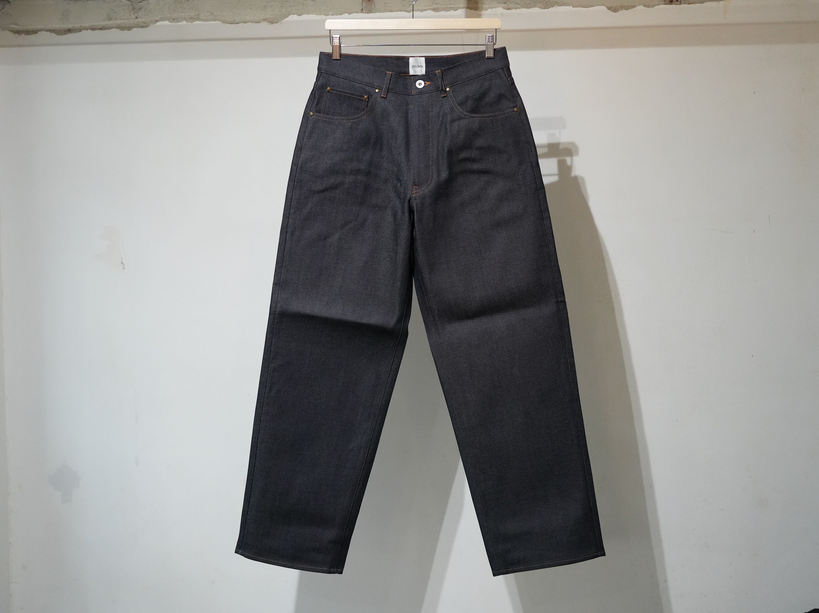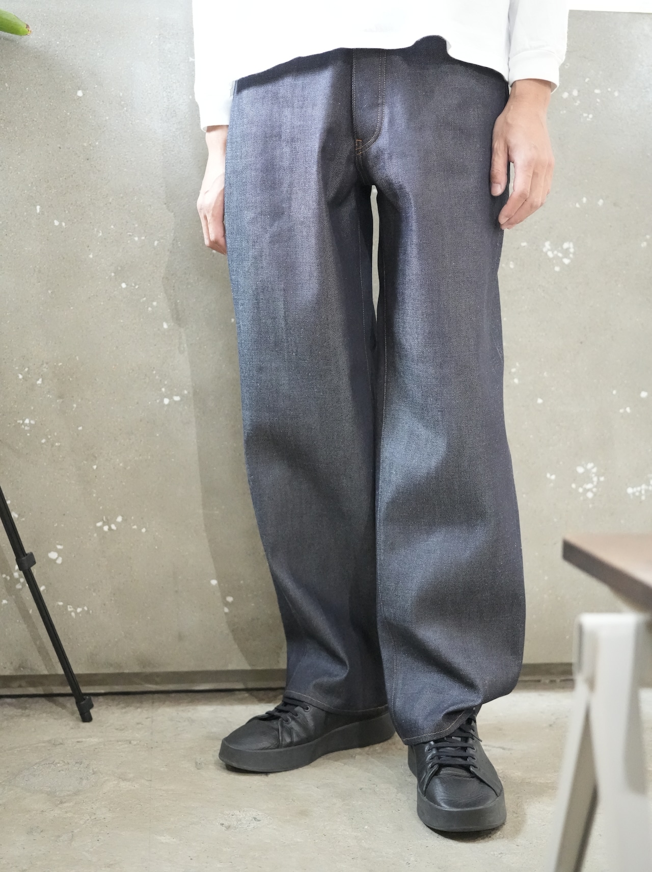 かなり太い糸を使用していますが、糸の形 の調整や撚りを緩く紡ぐことで軽く優しい 雰囲気になるように仕上げたデニム地。ピ ュアインディゴで染色した混じり気のない ブルー。オーソドックスな5ポケットのデニ ムはややウエストを大きくし股上を浅く、腰 で履く設定にしています。
